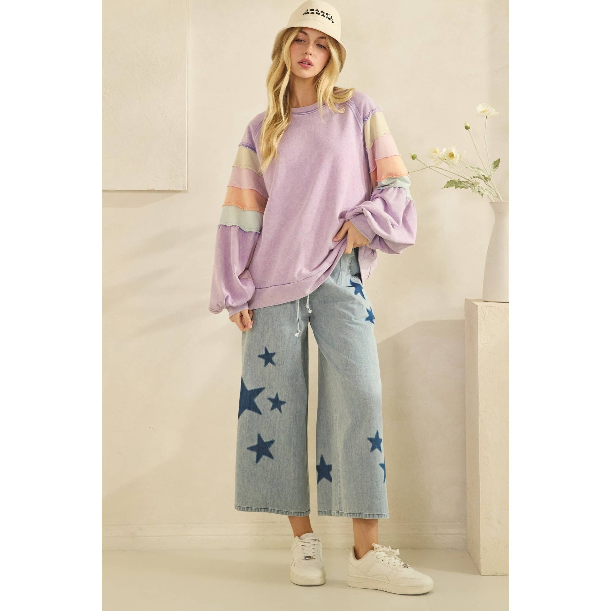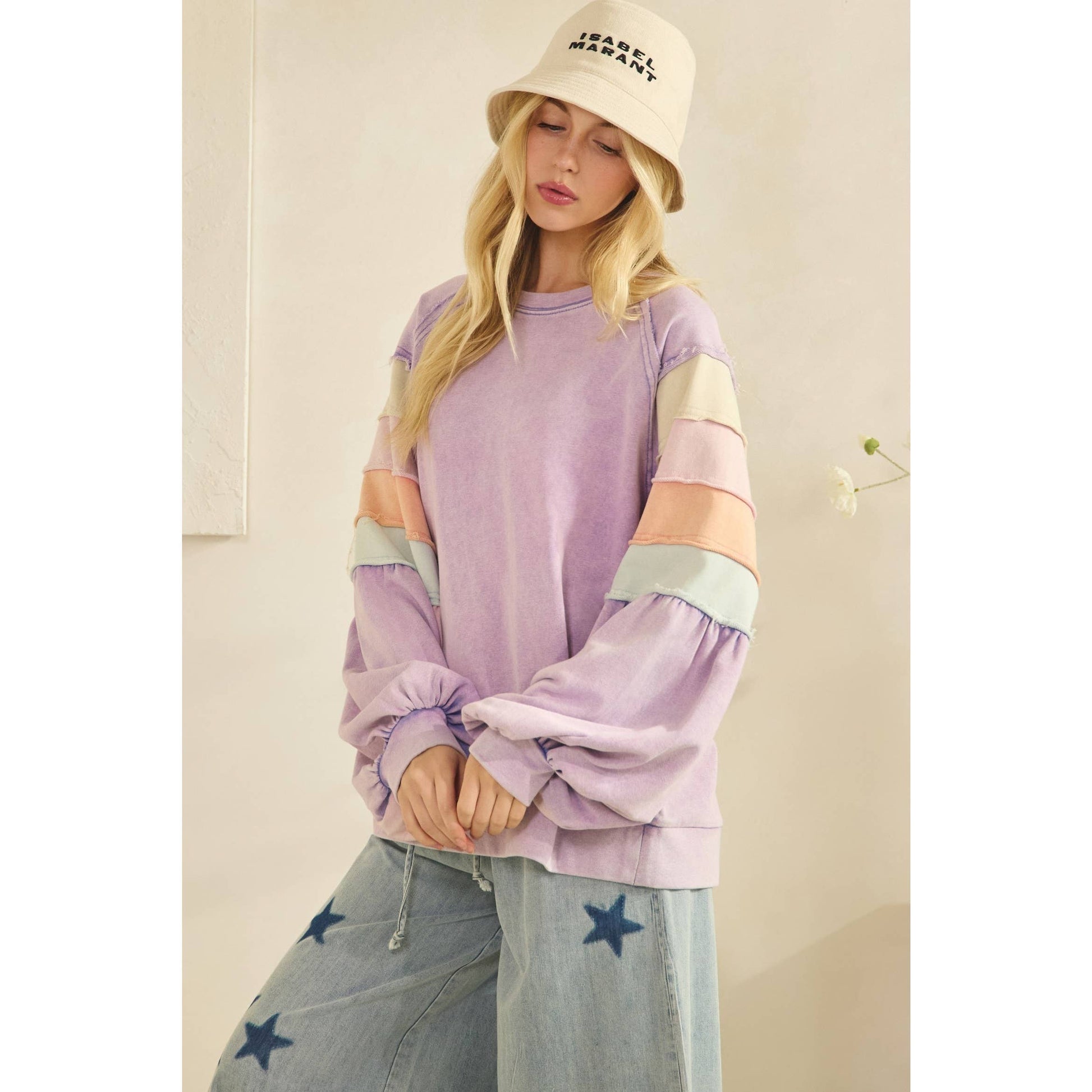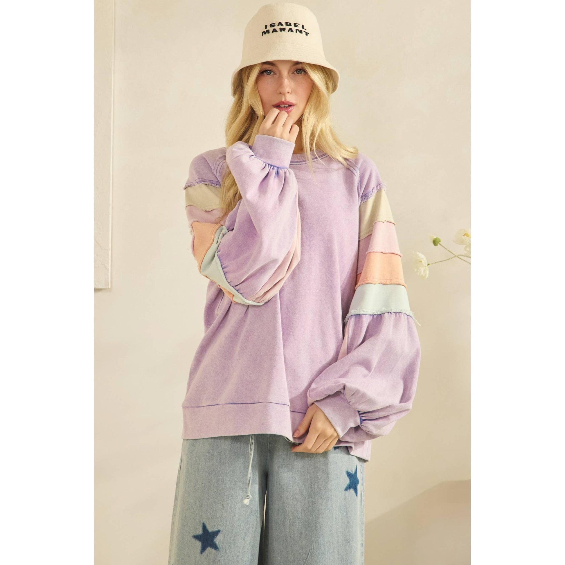 Featuring long balloon sleeves with elastic cuffs and exposed seam details for a lived-in look, this pullover pairs beautifully with denim and booties for an easy boutique-style outfit.